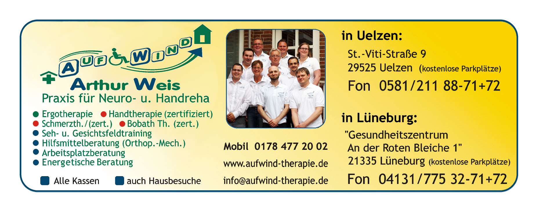 AufWind Praxis für Neuro und Handreha Arthur Weis St.-Viti-Straße 9 29525 Uelzen Anfahrt | Kurzinfo Tel.: 0581 / 211 88 71 o. 72 | Fax: 0581 / 211 88 70 Mobil: 0178 / 477 20 02